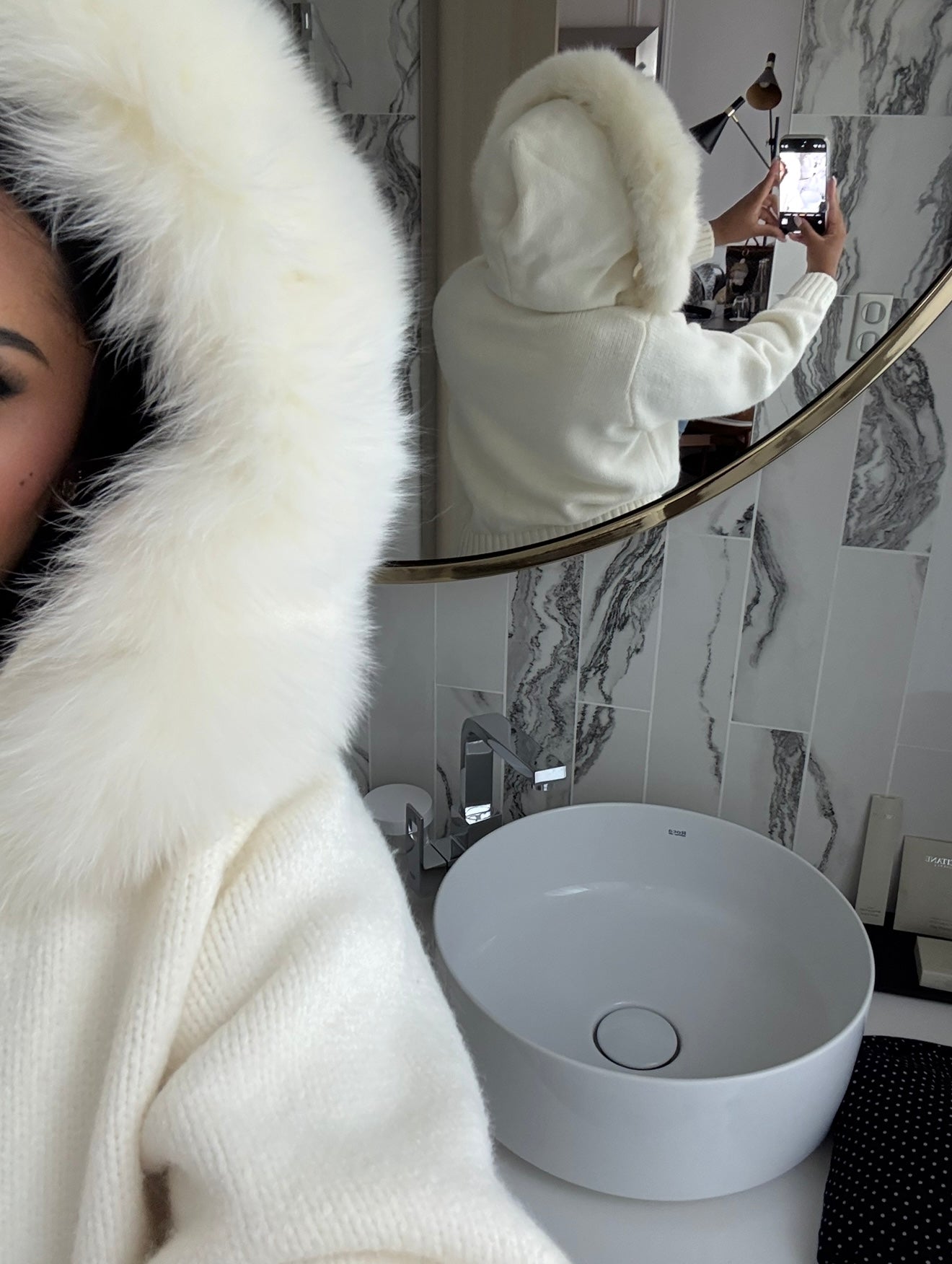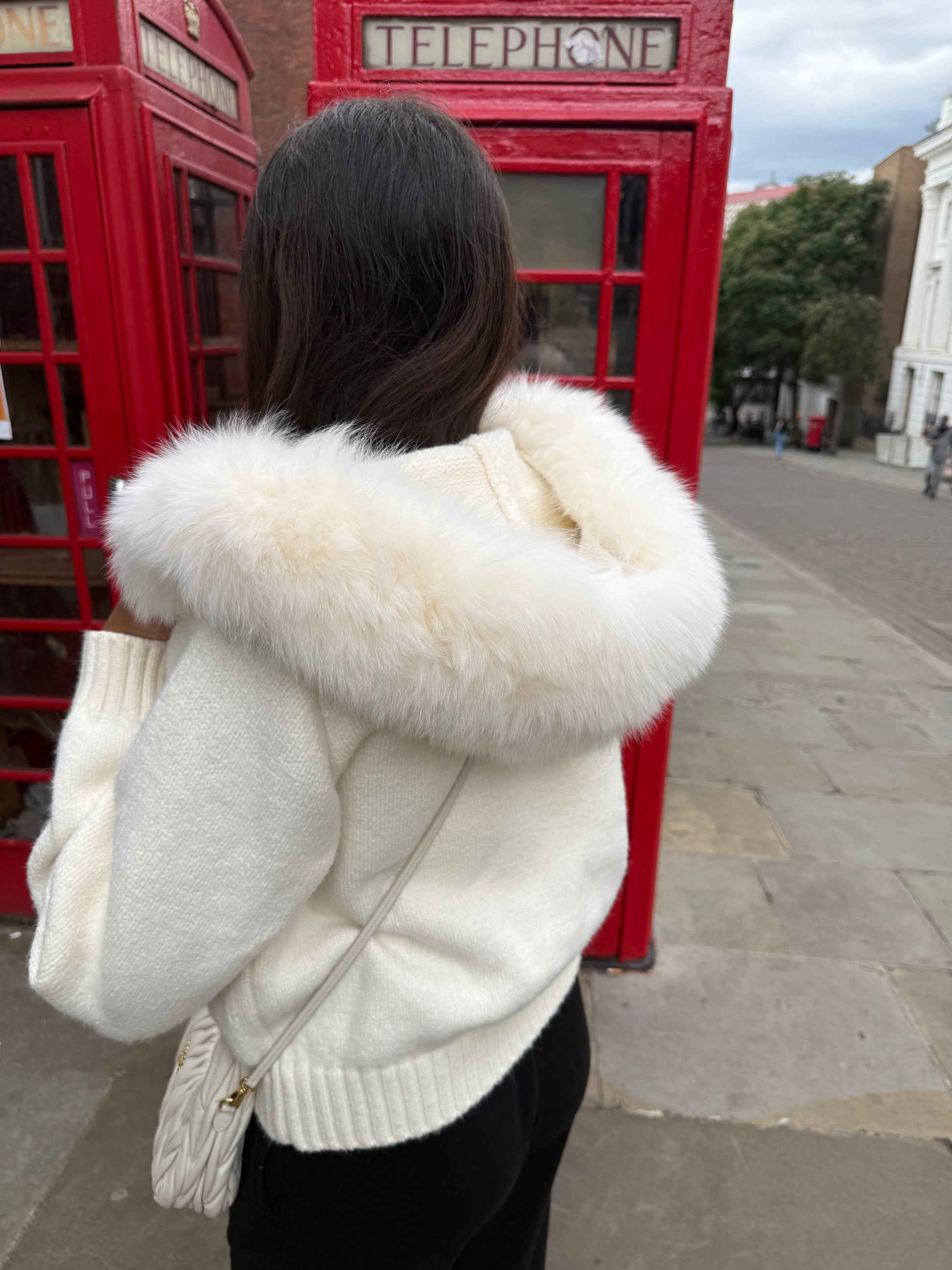 A cosy fusion between a cardigan and a jacket. The Chantilly wraps you in a creamy cloud of luxury. Featuring a real fox fur-trimmed hood and a soft ivory knit, this piece is made for cosy days and clean girl aesthetics. Ribbed hems, double zip closure, and a flattering fit make it both effortless and elevated. Think hot chocolate, fresh air, and that “I just glow" look.