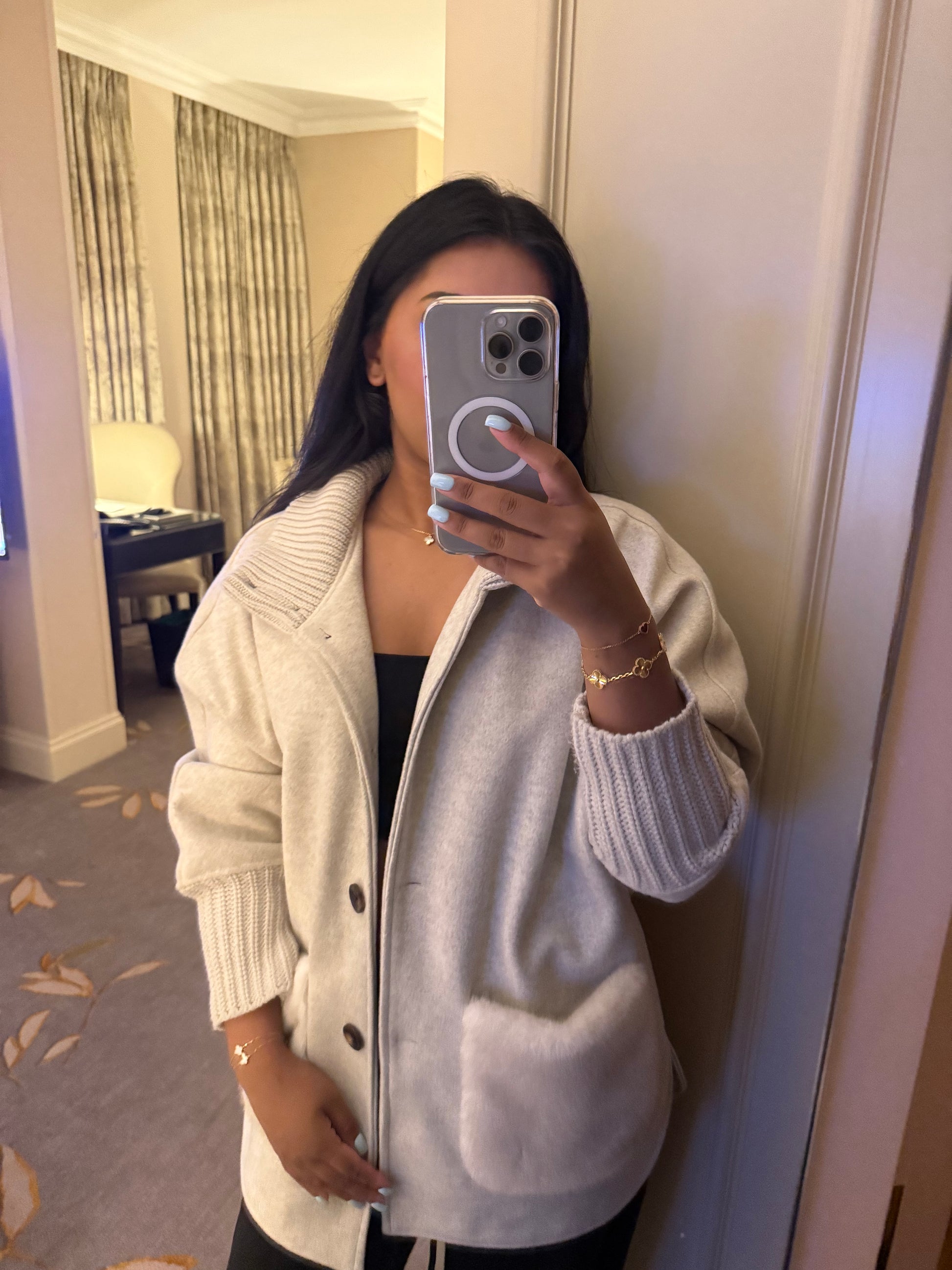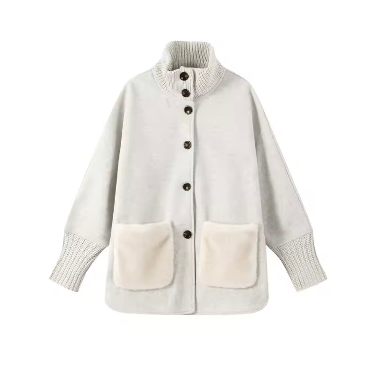Crafted from a soft cashmere and wool-blend fabric, The LUMIÈRE Jacket is designed with ribbed knit detailing and a relaxed silhouette for effortless, everyday elegance. Finished with oversized front mink patch pockets and a structured ribbed collar, it balances comfort with understated luxury.