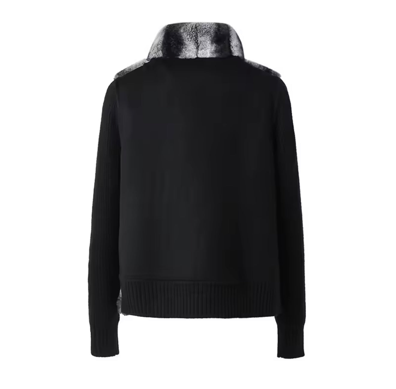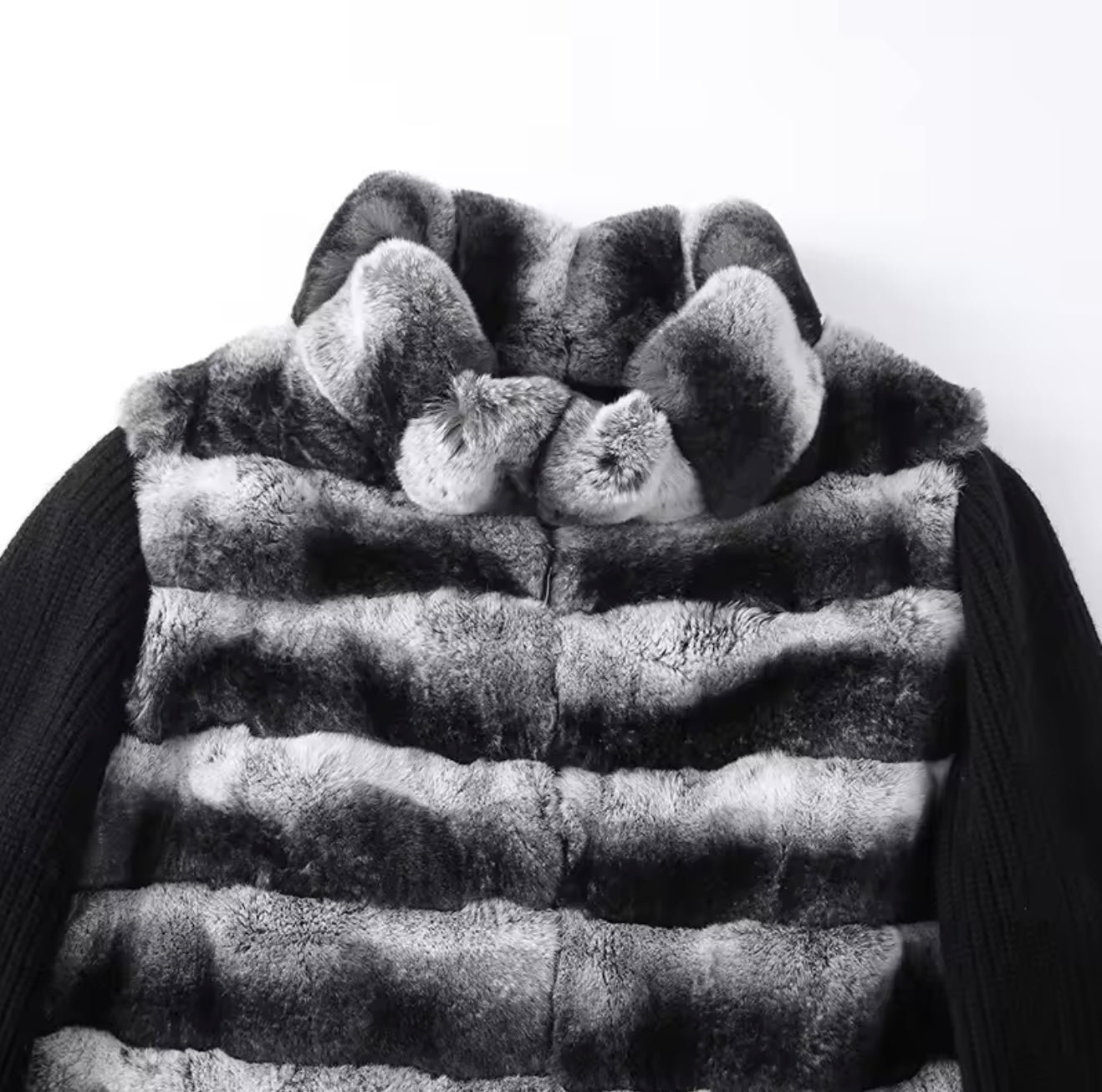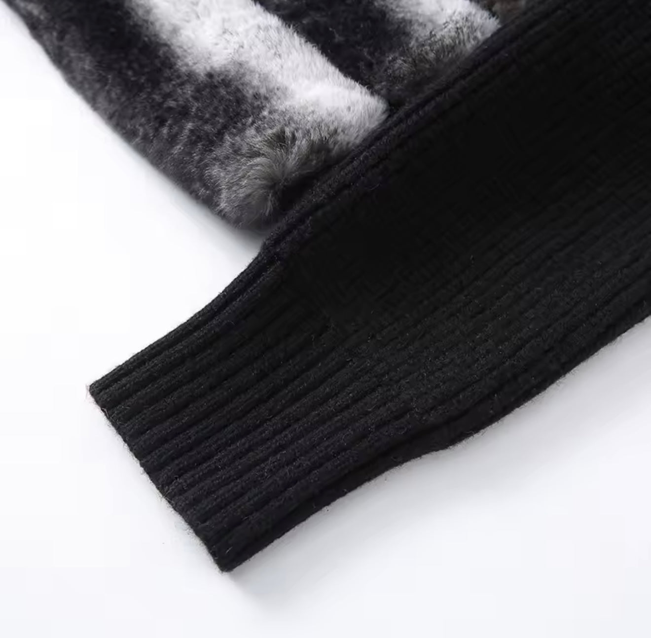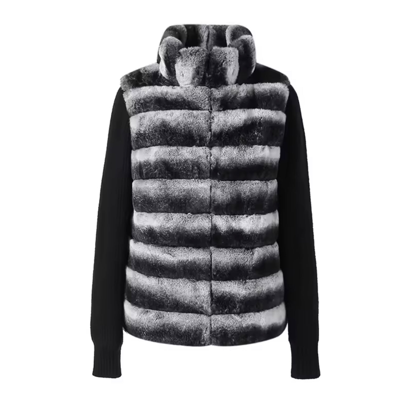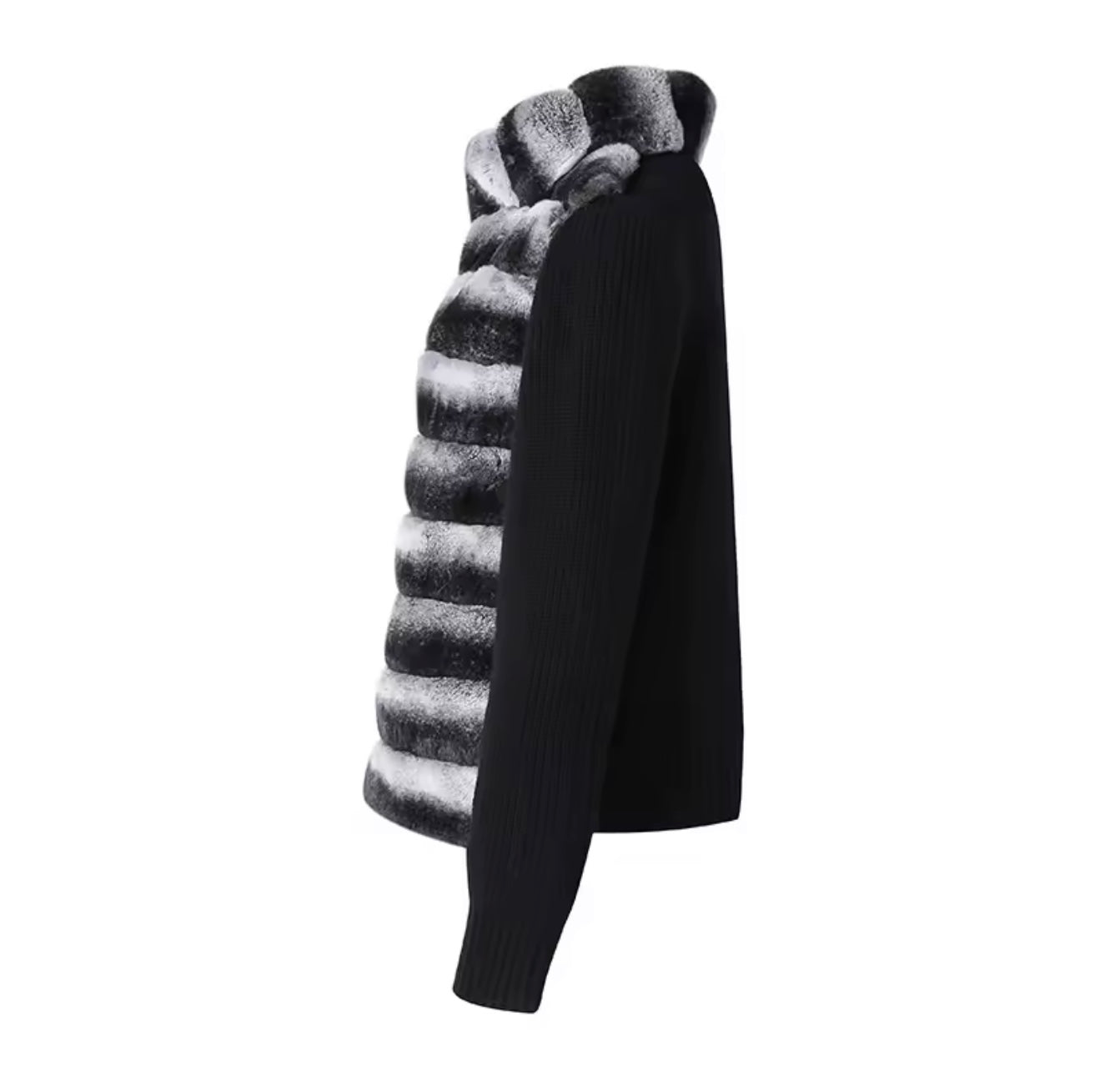 The Zaya Jacket features a luxuriously soft black and white rex rabbit fur body, paired with contrasting wool knit sleeves for elevated texture and comfort. The jacket has a detachable fur collar allowing for versatile styling, while giving it polished and plush look.